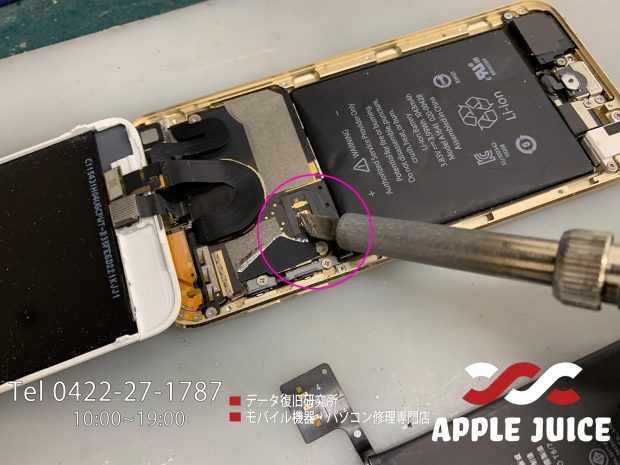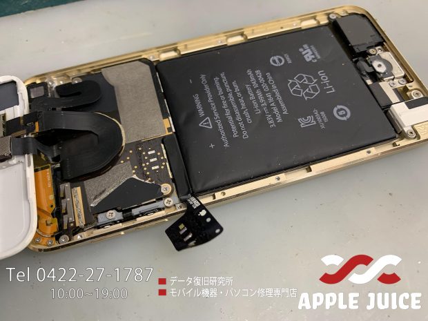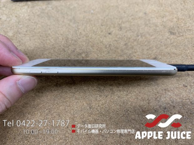 さらに膨らんだバッテリーがガラスと本体の隙間に押し込まれ、ホームボタンが見えない状態でご来店いただきました。
