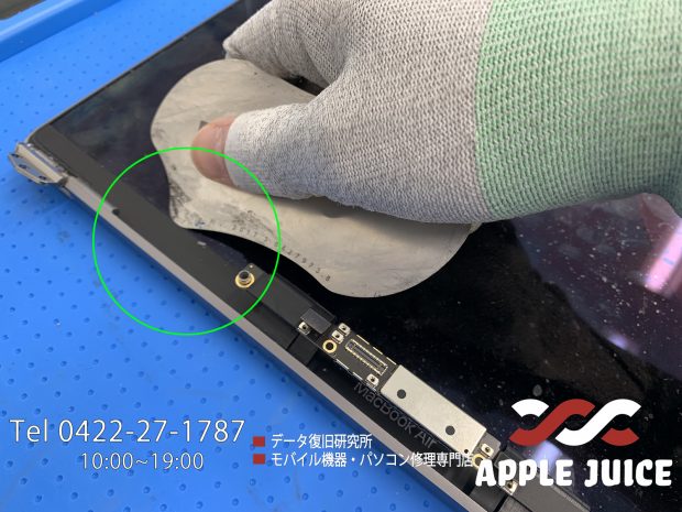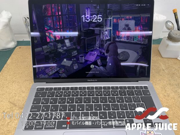液晶が完全に割れ、画面には虹色の縦線・横線のみが映る状態でお預かりしたMacBook Air 13インチ(A2337)です。